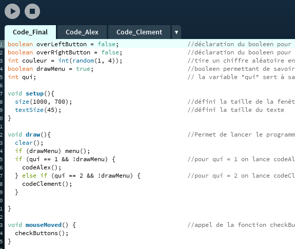 Au début de ce projet nous devions nous former à l’utilisation de Processing en autonomie, grâce à des cours préparés par les professeurs et à internet (OpenClassroom, flossmanual..). Suite à cette auto-formation il nous à été demandé de rendre une applications montrant ce qu’on avait appris. Pour ce premier rendu nous avions créer un « menu » permettant d’accéder à 2 animations différentes.